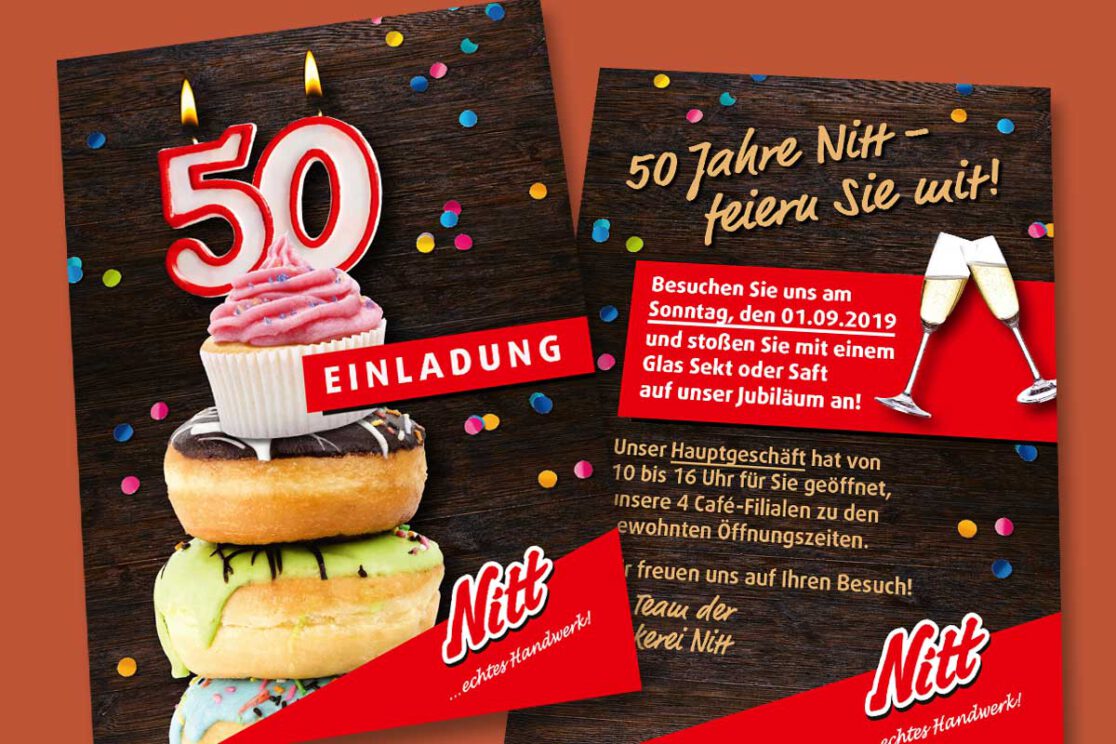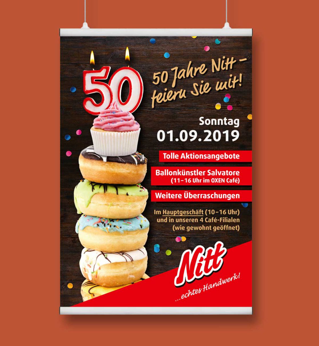 Kampagnen für das 50-jährige Jubiläum, Mitarbeitersuche und Café-Neueröffnung. Designauftritt und Mitentwicklung der Texte. Kundenberatung und Koordination durch Nicole Schipper von nz Marketing.