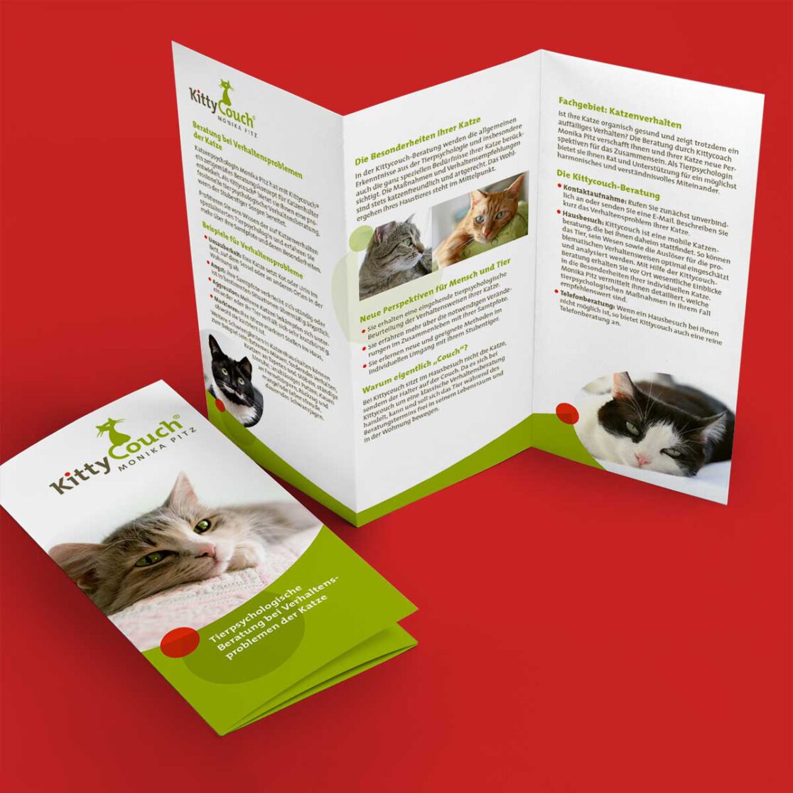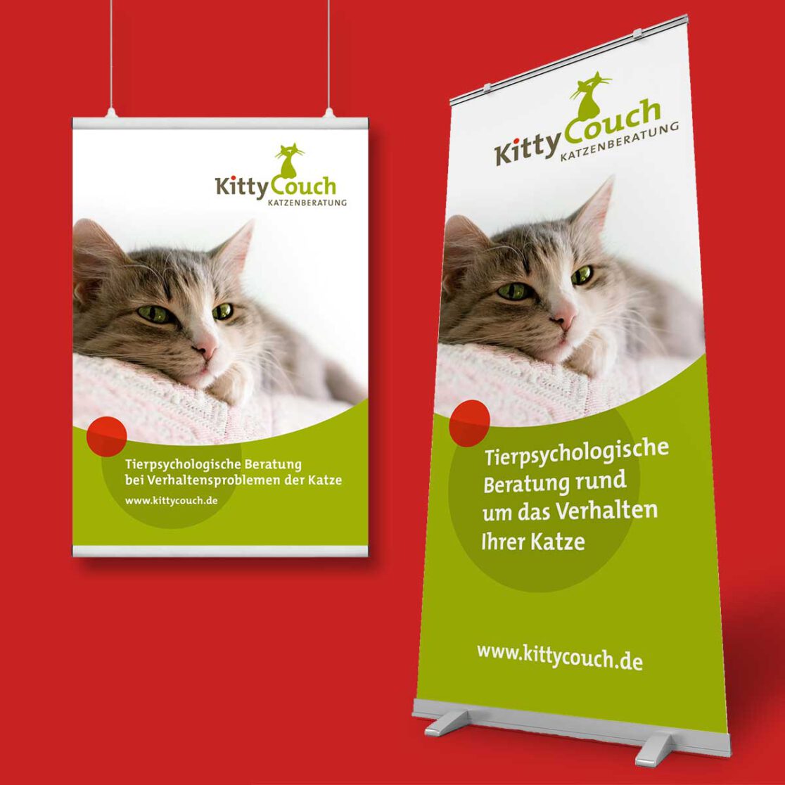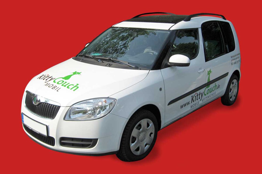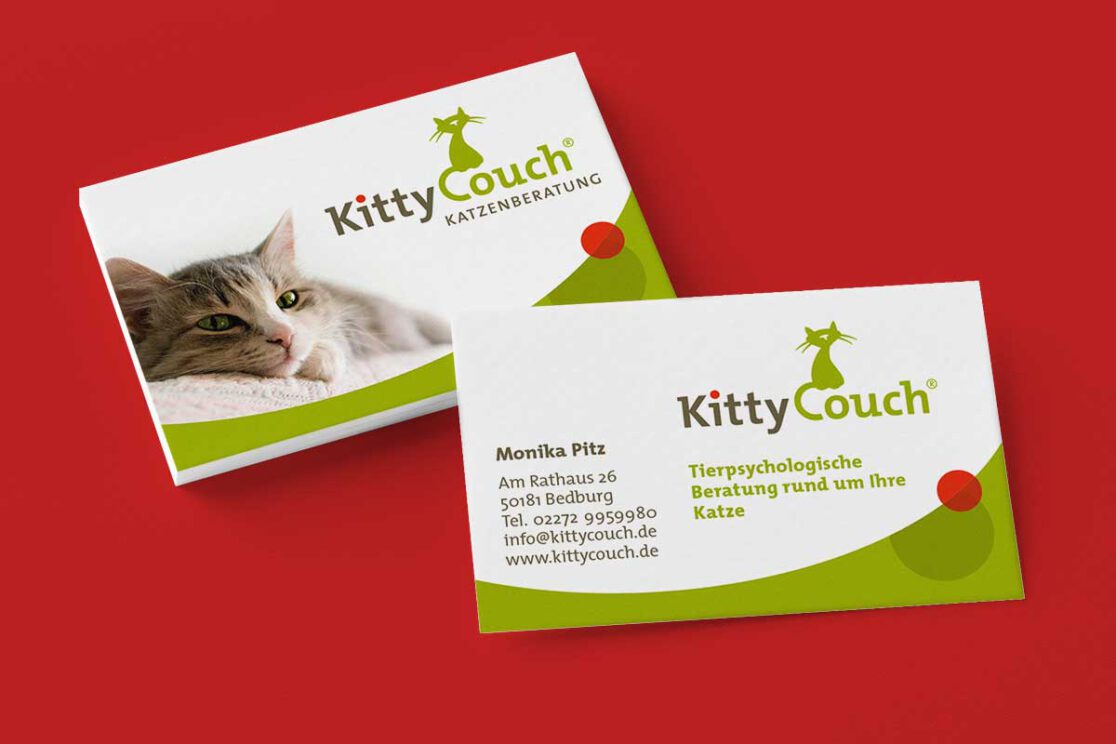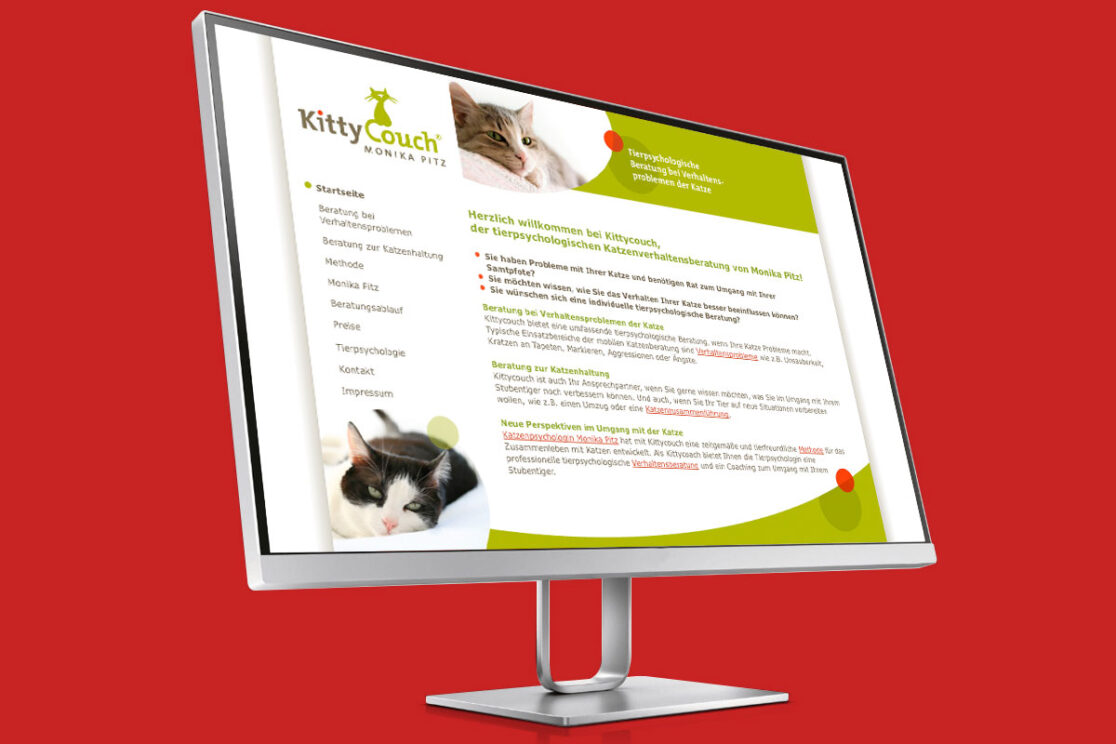 Ein sympathisches und bildhaftes Logo wünschte sich die Tierpsychologin Monika Pitz für ihre neue Selbständigkeit. Das „Kittycouch Mobil”, ihr Firmenwagen, fiel dem WDR ins Auge – der drehte daraufhin eine kleine Dokumentation über ihre Arbeit mit verhaltensauffälligen Katzen und deren beratungsbedürftigen Haltern.