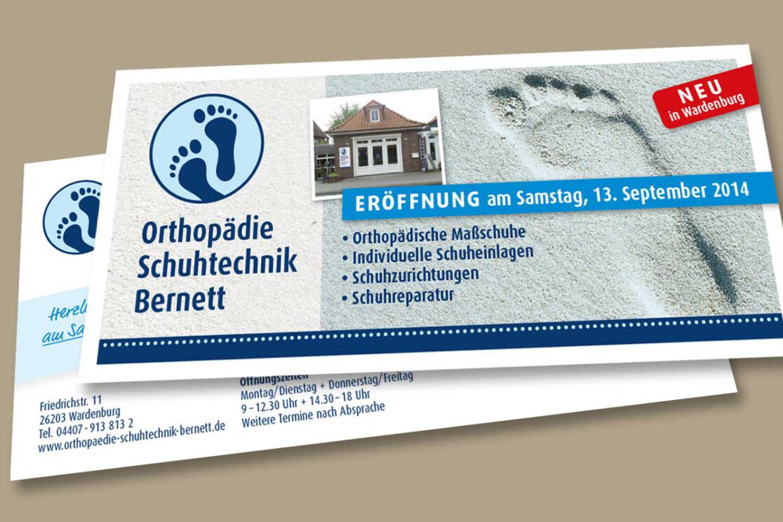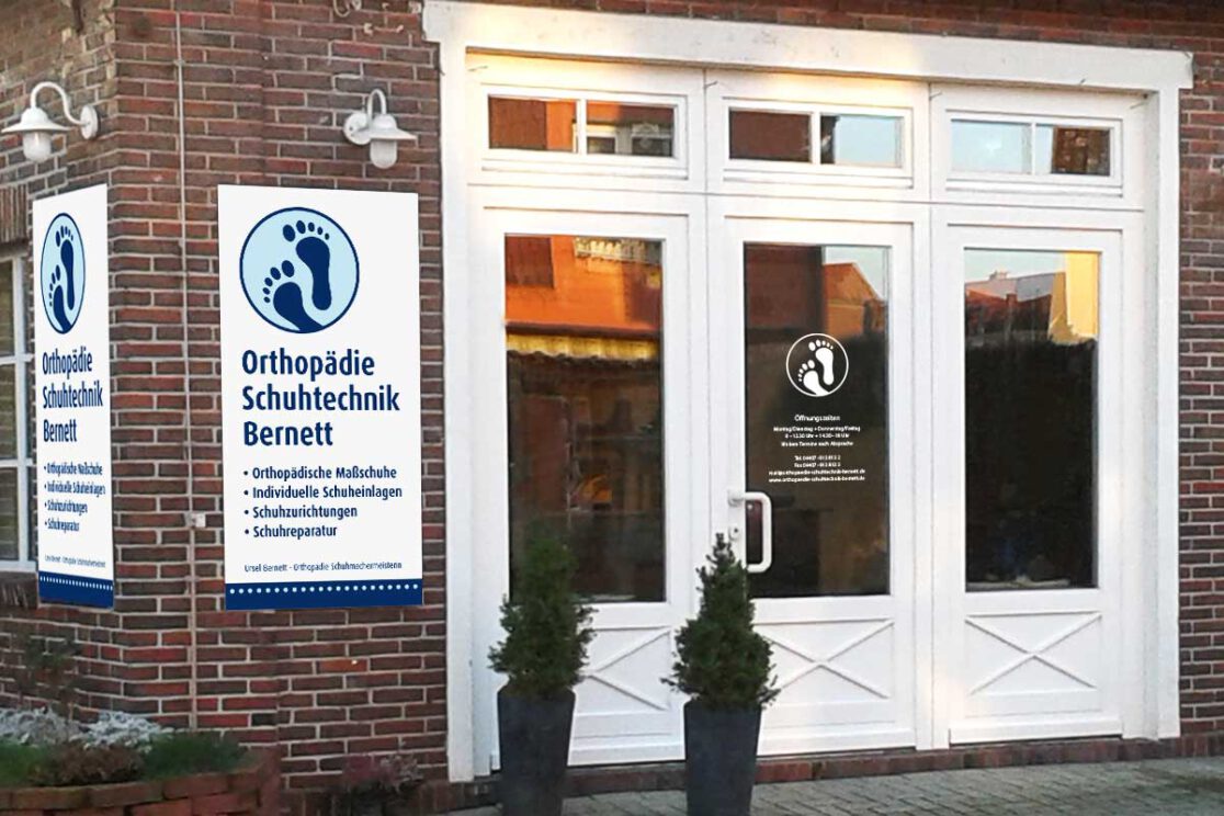 Meine Kundin mit der längsten Berufsbezeichnung: Orthopädieschuhmachermeisterin Ursel Bernett. Durchgängiges Corporate Design vom Firmenschild bis zum Abholschein. Programmierung der Website mit dem CMS Typo3 durch Wolfgang Schröder von netzweber.